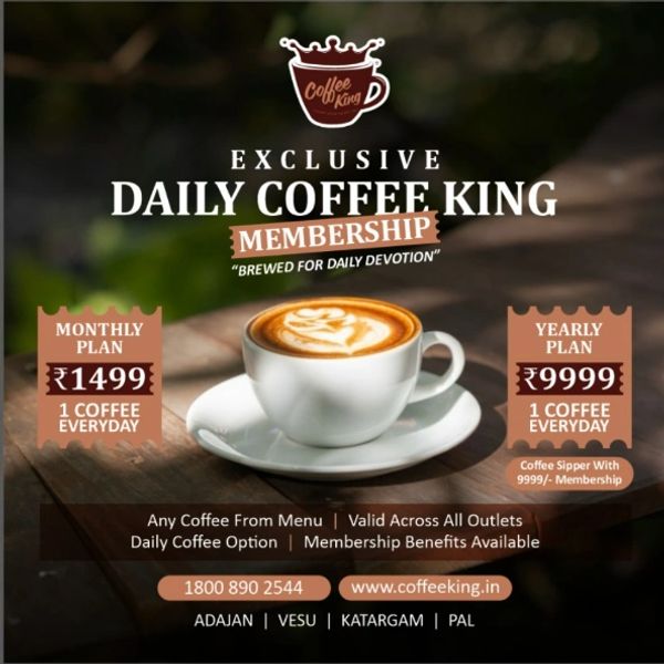 Welcome to Coffee King! We've been a cool place in Surat since 2015, with three lounges and a little kiosk. Our goal is to give you awesome food, specialty coffee, and yummy desserts—all at fair prices.